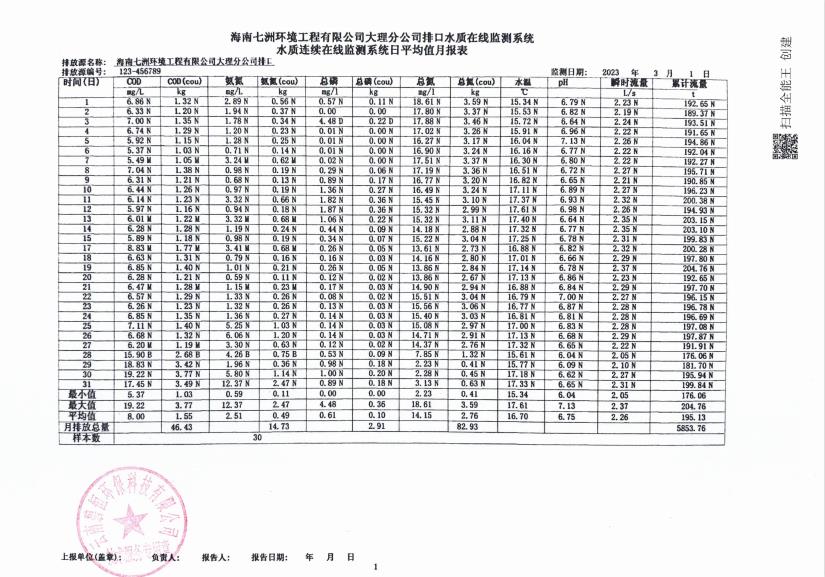 海南七洲環境工程有限公司大理分公司排口水質在線監測系統水質連續在線監測系統日平均值月報表