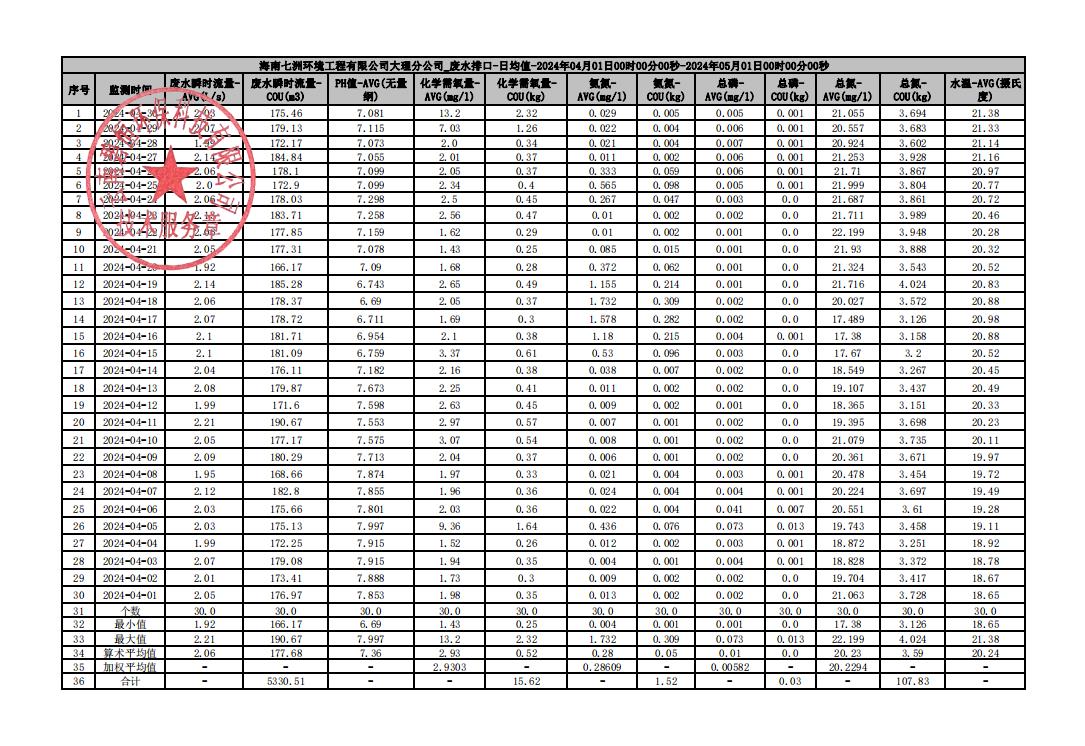 海南七洲環境工程有限公司大理分公司排口水質在線監測系統水質連續在線監測系統日平均值月報表