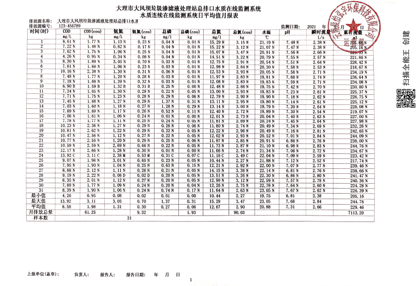 大理市大風壩垃圾濾液處理站總排口水質在線監測系統水質連續在線監測系統日平均值月報表