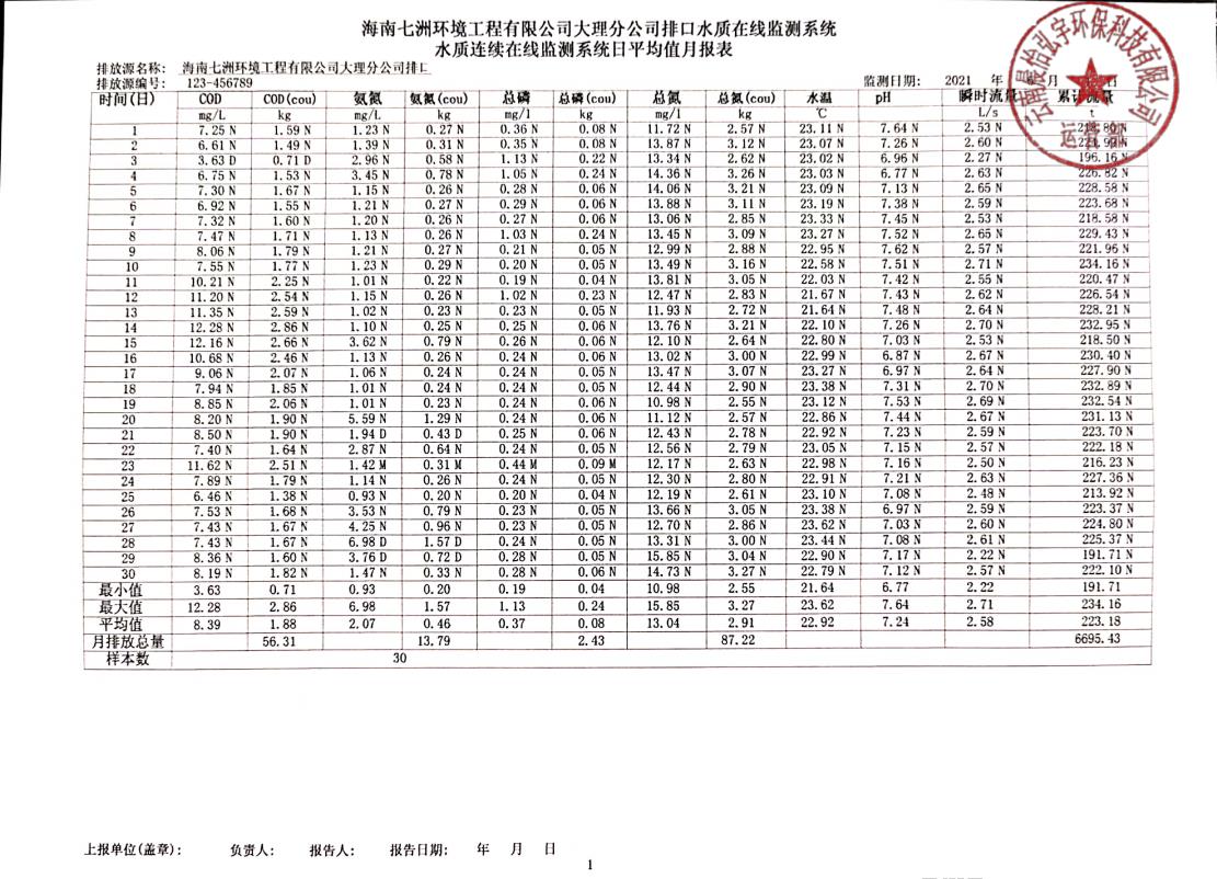海南七洲環境工程有限公司排口水質在線監測系統水質連續在線監測系統日平均值月報表