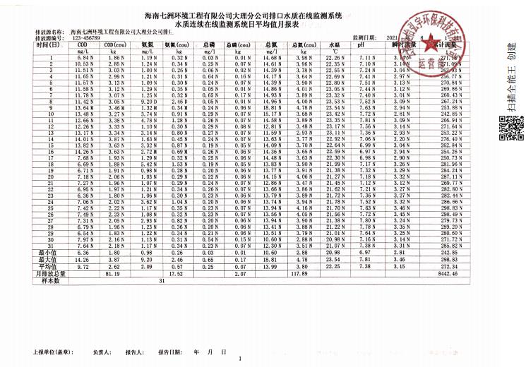 海南七洲環境工程有限公司大理分公司排口水質在線監測系統水質連續在線監測系統日平均值月報表