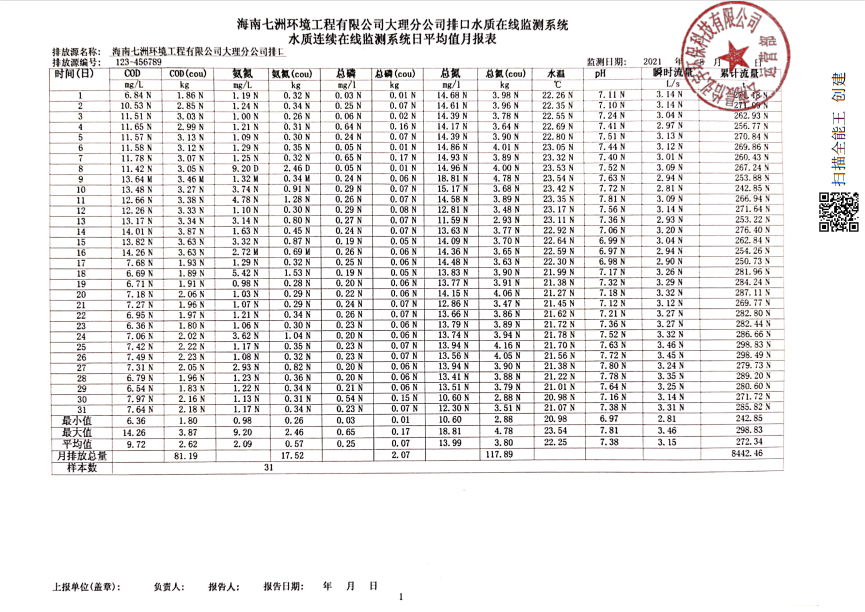 海南七洲環(huán)境工程有限公司大理分公司排口水質(zhì)在線監(jiān)測(cè)系統(tǒng)水質(zhì)連續(xù)在線監(jiān)測(cè)系統(tǒng)日平均值月報(bào)表