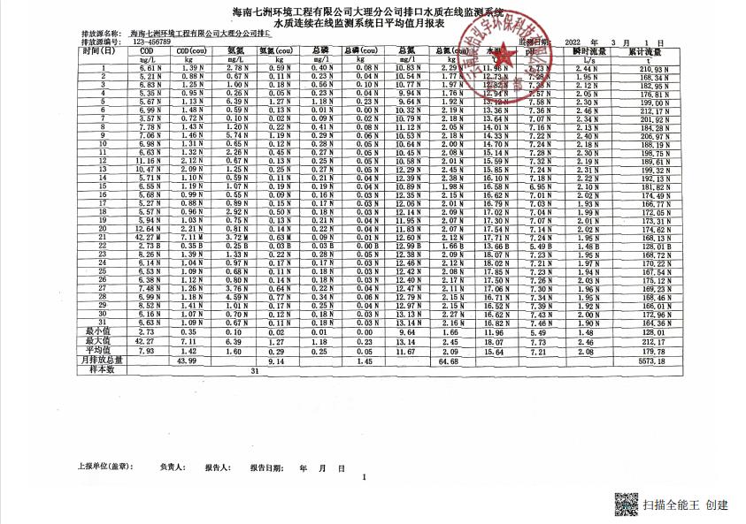 海南七洲環(huán)境工程有限公司大理分公司排口水質(zhì)在線監(jiān)測系統(tǒng)水質(zhì)連續(xù)在線監(jiān)測系統(tǒng)日平均值月報表