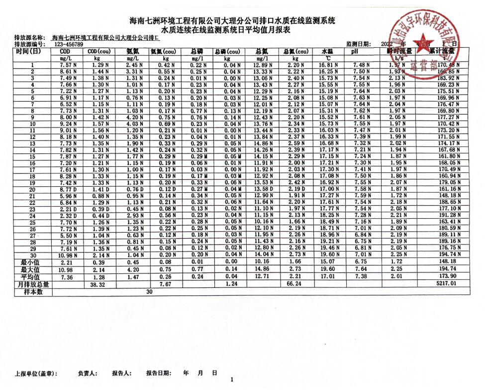 海南七洲環境工程有限公司大理分公司排口水質在線監測系統水質連續在線監測系統日平均值月報表