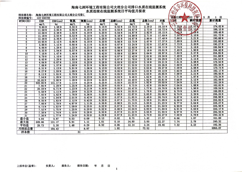 海南七洲環境工程有限公司大理分公司排口水質在線監測系統水質連續在線監測系統日平均值月報表