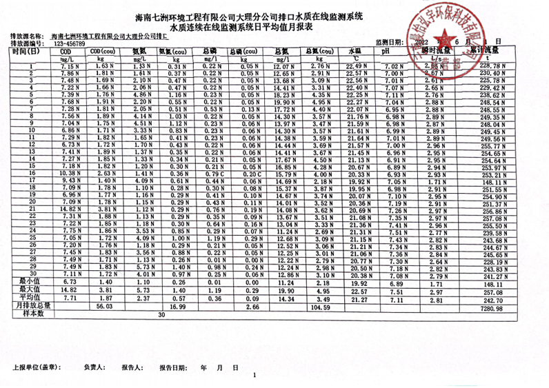 海南七洲環境工程有限公司大理分公司排口水質在線監測系統水質連續在線監測系統日平均值月報表
