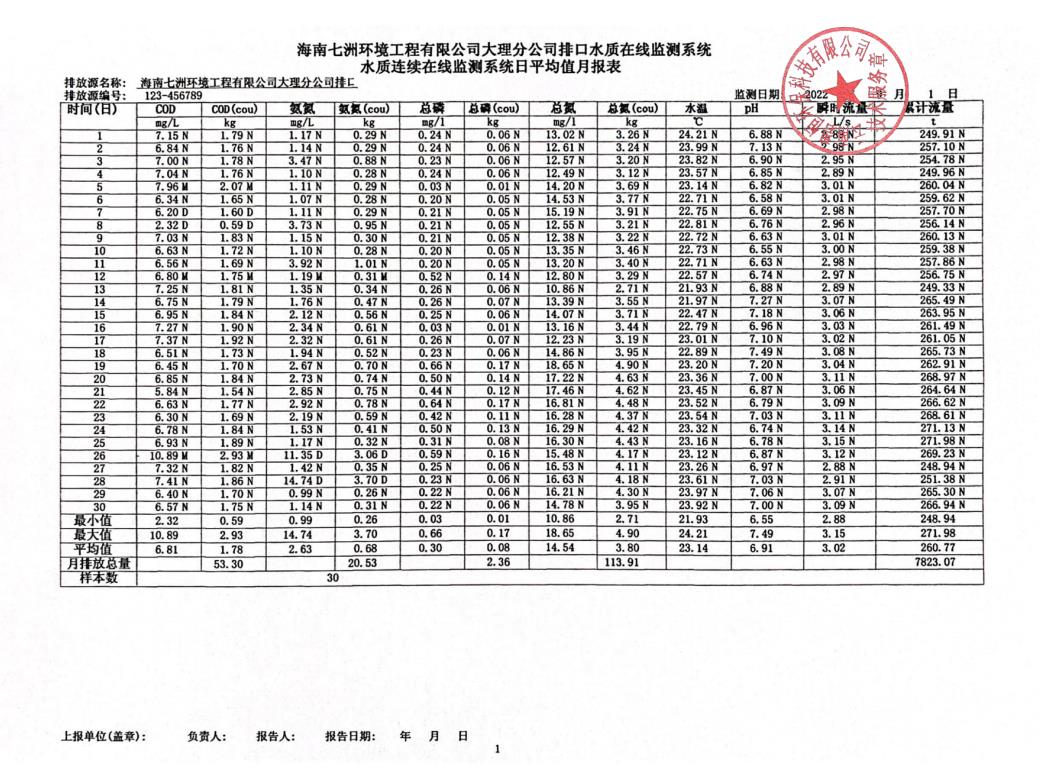 海南七洲環境工程有限公司大理分公司排口水質在線監測系統水質連續在線監測系統日平均值月報表