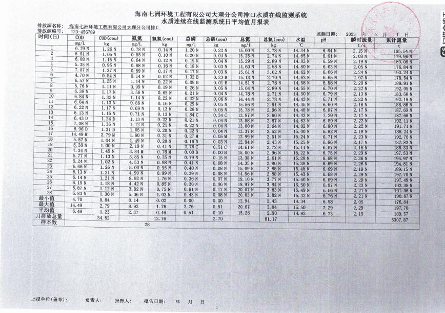 海南七洲環境工程有限公司大理分公司排口水質在線監測系統水質連續在線監測系統日平均值月報表