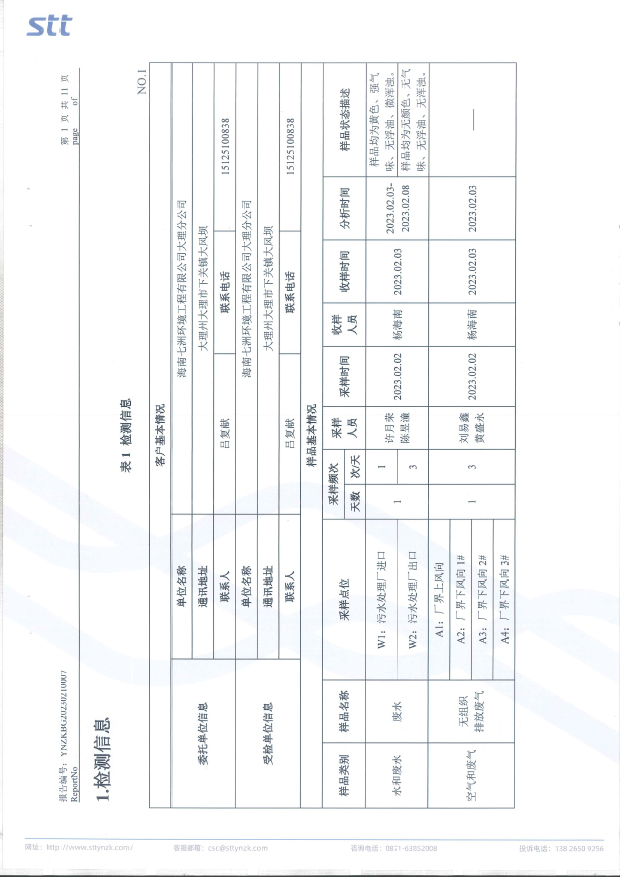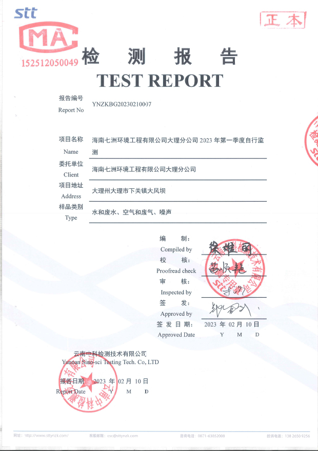 海南七洲環(huán)境工程有限公司大理分公司2023年第一季度自行監(jiān)測
