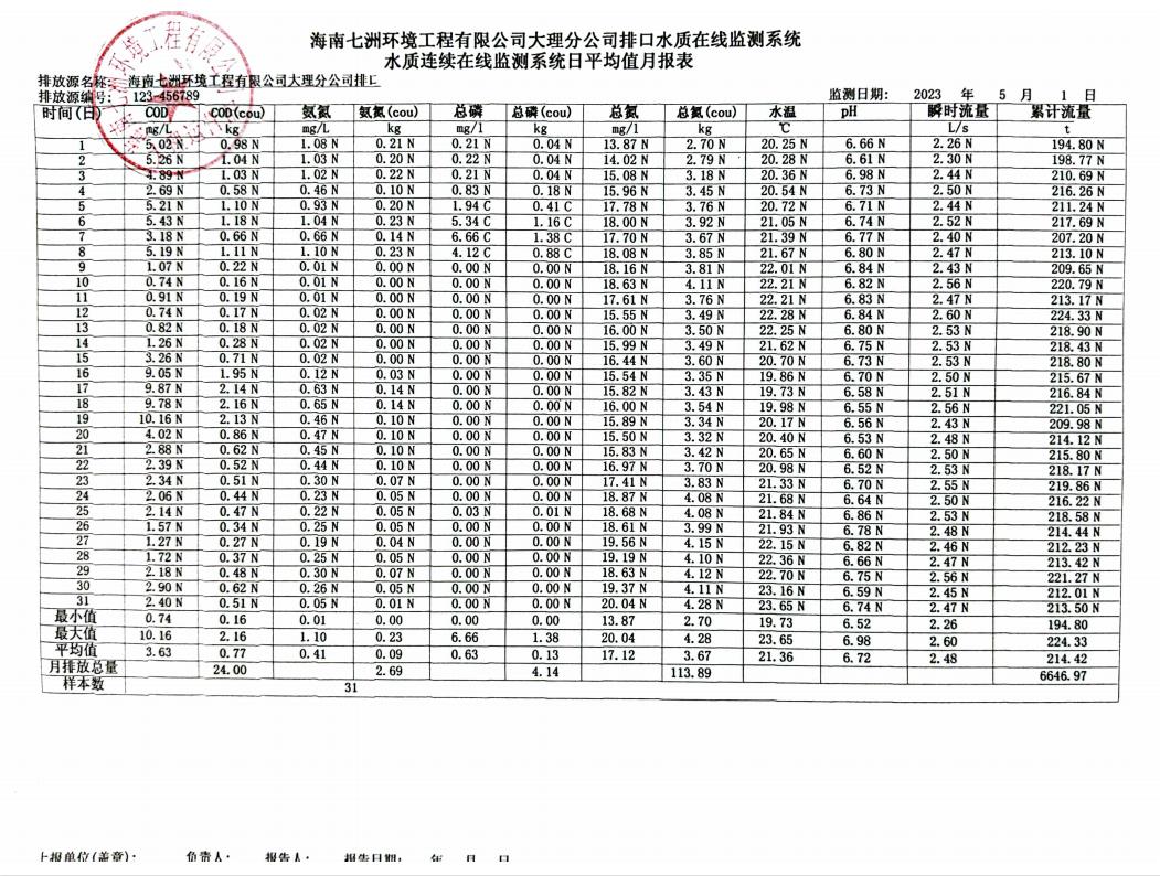 海南七洲環(huán)境工程有限公司大理分公司排口水質(zhì)在線監(jiān)測(cè)系統(tǒng)水質(zhì)連續(xù)在線監(jiān)測(cè)系統(tǒng)日平均值月報(bào)表
