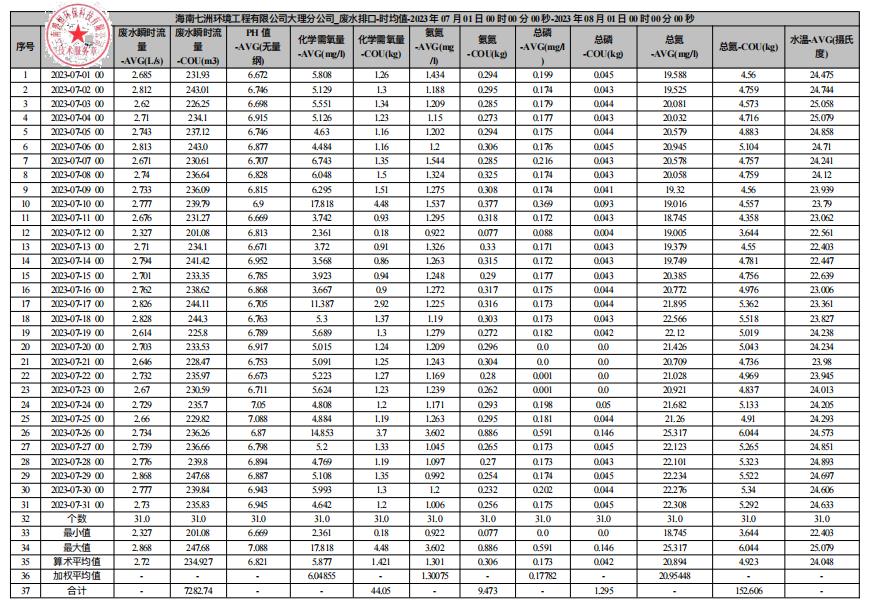 海南七洲環境工程有限公司大理分公司排口水質在線監測系統水質連續在線監測系統日平均值月報表