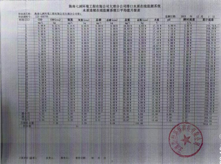 海南七洲環境工程有限公司大理分公司排口水質在線監測系統水質連續在線監測系統日平均值月報表